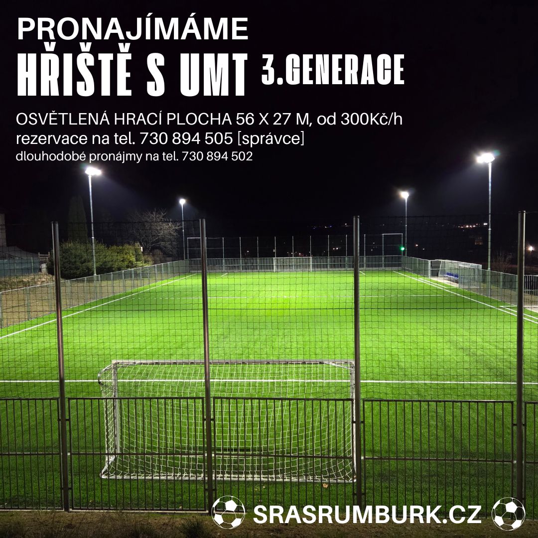 Pronajímáme veřejnosti a sportovním klubům hřiště s umělým trávníkem III.generace. Rozměry hřiště jsou 56 x 27 m, je možné jej osvětlit. Cena je 300 Kč/h, osvětlení 100 Kč/h, šatna k UMT 300 Kč. Základní pravidla: 1. Vstup pouze určenými vstupy v čisté sportovní obuvi. 2. Zákaz vstupu v kopačkách s kolíky – pouze turfy/lisovky. 3. Zákaz vstupu a konzumace jídla vč. žvýkaček a sladkého pití. 4. Žádné sklo ! 5. Zákaz kouření a manipulace s ohněm. 6. Zákaz vjezdu kol, koloběžek, bruslí a vstup se zvířaty. 7. Udržujte čistotu a pořádek. 8. Respektujte herní časy. 9. Závady hlaste správci areálu (730 894 505 nebo 412 332 490).
